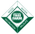 Dans une forme ronde inscrite dans un carré est inscrit «certified TREE FARM» Sur chacun des côtés du logo carré qui contient ce rond sont inscrits 4 mots résumant les priorités du label. :